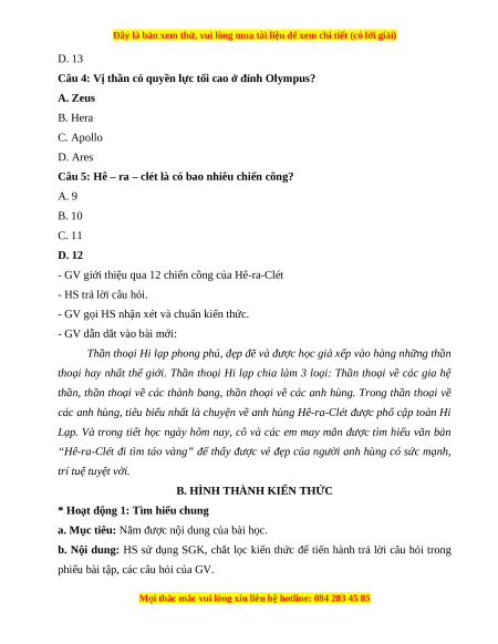 Câu 3: Theo thần thoại Hy Lạp, đỉnh Olympus có bao nhiêu vị thần? A. 10 B. 11 C. 12