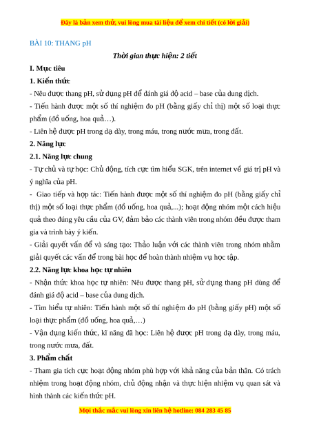 Đây là bản xem th , vu ử i lòng mua tài li u ệ đ xe ể m chi ti t ế (có l i ờ gi i ả ) BÀI 10: THANG pH Th i ờ gian th c hi ự n: ệ 2 ti t ế I. M c t ụ iêu 1. Ki n t ế h c ứ - Nêu đư c ợ thang pH, sử d ng pH ụ đ đánh gi ể á đ aci ộ d – base c a dung d ủ ch. ị - Ti n ế hành đư c ợ m t ộ số thí nghi m ệ đo pH (b ng ằ gi y ấ chỉ th ) ị m t ộ số lo i ạ th c ự