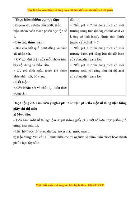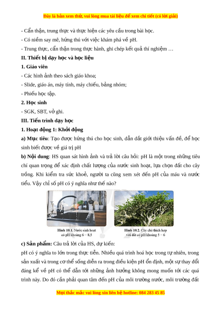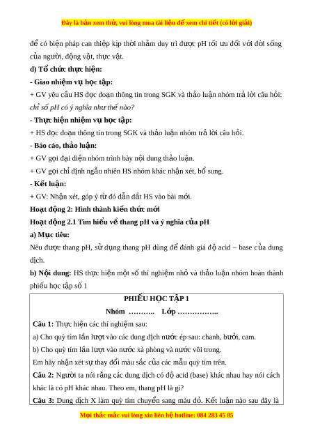 Đây là bản xem th , vu ử i lòng mua tài li u ệ đ xe ể m chi ti t ế (có l i ờ gi i ả ) - Cẩn th n, t ậ rung th c và t ự h c ự hi n các ệ yêu c u t ầ rong bài h c. ọ - Có ni m ề say mê, h ng t ứ hú v i ớ vi c khám ệ phá về pH. - Trung th c, ự c n t ẩ h n t ậ rong th c hành, ghi ự chép k t ế qu t ả hí nghi m ệ … II. Thi t ế b d ị y h ạ c ọ và h c l ọ i u ệ 1. Giáo viên - Các hình nh t ả heo sách giáo khoa;