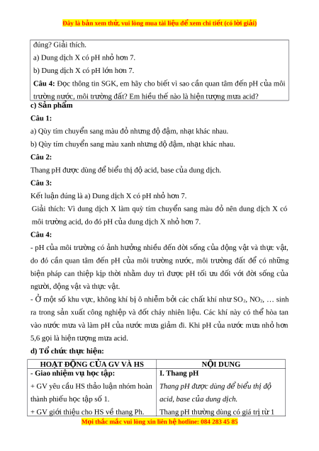 ọ thông tin SGK, em hãy cho bi t ế vì sao c n ầ quan tâm đ n ế pH c a ủ môi trư ng n ờ ư c, ớ môi trư ng ờ đ t ấ ? Em hi u t ề h nào l ế à hi n t ệ ư ng m ợ a ư acid? c) S n ph ả m ẩ Câu 1: a) Quy tím chuy n s ể ang màu đ nh ỏ ng đ ư ộ đ m ậ , nh t ạ khác nhau. b) Quy tím chuy n s ể ang màu xanh nh ng đ ư đ ộ m ậ , nh t ạ khác nhau. Câu 2: Thang pH đư c ợ dung đ bi ể u t ể h đ ị aci ộ d, base c a dung d ủ ch. ị Câu 3: K t ế lu n ậ đúng là a) Dung d ch X ị có pH nh h ỏ n ơ 7. Gi i ả thích: Vì dung d ch ị X làm quỳ tím chuy n