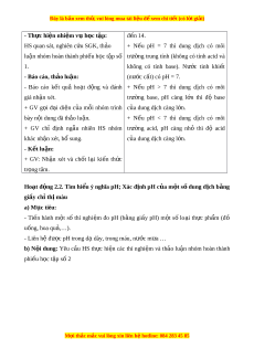 ớ các thành viên trong nhóm nh m ằ gi i ả quy t ế các v n đ ấ t ể rong bài h c đ ọ hoàn t ể hành nhi m ệ v h ụ c ọ t p. ậ 2.2. Năng l c khoa h ự c t ọ nhi ự ên - Nh n ậ th c ứ khoa h c ọ tự nhiên: Nêu đư c ợ thang pH, s ử d ng ụ thang pH dung để đánh giá đ aci ộ d – base c a dung d ủ ch. ị - Tìm hi u ể tự nhiên: Ti n ế hành m t ộ s ố thí nghi m ệ đo pH (b ng ằ gi y ấ pH) m t ộ số lo i ạ th c ph ự m
