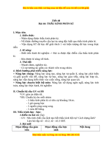 Mục tiêu: - Nhân d ng ạ đư c t ợ h u kí ấ nh phân kỳ. - Vẽ đư c ợ đư ng t ờ ruy n c ề a hai ủ tia sáng đ c ặ bi t ệ qua th u kí ấ nh phân kì. - V n ậ d ng ụ KT đã h c ọ để gi i ả thích 1 vài hi n ệ tư ng ợ đã h c ọ trong th c ự ti n ễ Phư ng ơ pháp d y ạ h c: ọ D y ạ h c ọ nhóm; d y ạ h c ọ nêu và gi i ả quy t ế v n ấ đề; phư ng ơ pháp thuy t ế trình; s d ử ng đ ụ ồ dung tr c ự quan Đ nh h ị ư ng ớ phát tri n năng l ể c ự : Năng l c t ự h c nghi ự m ệ , năng l c quan s ự át, năng l c s ự áng t o, năng l ạ c ự trao đ i ổ . Ph m ẩ ch t ấ t t ự in, t l ự p, ậ giao ti p. ế 1: Đ t ặ v n đ ấ . ề Đặc đi m ể c a t ủ h u kí ấ nh phân kỳ (10p) => Đ t ặ v n ấ đ : ề Th u ấ I. Đ c ặ đi m ể c a ủ th u ấ kính kính phân kì có đ c ặ phân kỳ đi m ể gì khác th u ấ kính