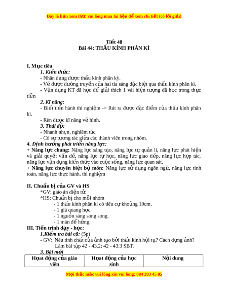 ệ bộ môn: Năng l c ự sử d ng ụ ngôn ng , ữ năng l c ự tính toán, năng l c t ự h c hành, t ự hí nghi m ệ II. Chu n b ẩ c ị a G ủ V và HS *GV: giáo án đi n t ệ . ử *HS: Chu n b ẩ cho m ị i ỗ nhóm - 1 th u k ấ ính phân kì có tiêu c kho ự ng ả 10cm. - 1 giá quang h c ọ - 1 nguồn sáng song song. - 1 màn đ h ể ng. ứ III. Ti n t ế rình d y - ạ h c: ọ 1.Ki m