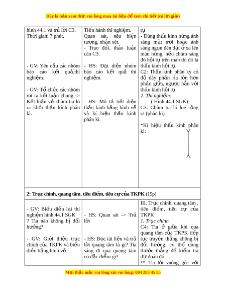 Đây là bản xem th , vu ử i lòng mua tài li u ệ đ xe ể m chi ti t (c ế ó l i ờ gi i ả ) hình 44.1 và tr l ả i ờ C3. Ti n hành t ế hí nghi m ệ . tụ Th i ờ gian: 7 phút. Quan sát, nêu hi n ệ - Dùng th u ấ kính h ng ứ ánh tư ng, ợ nh n xét ậ . sáng m t ặ tr i ờ ho c ặ ánh - Trao đ i ổ , th o ả lu n ậ sáng ng n ọ đèn đ t ặ ở xa lên câu C3. màn h ng, ứ n u ế chùm sáng đó h i