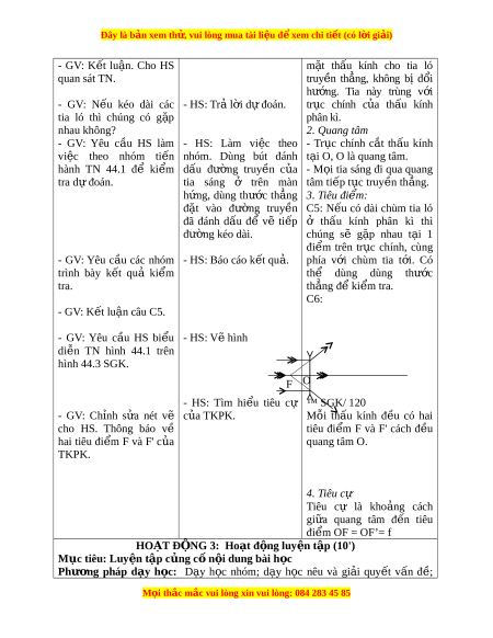 Đây là bản xem th , vu ử i lòng mua tài li u ệ đ xe ể m chi ti t (c ế ó l i ờ gi i ả ) - GV: K t ế lu n. ậ Cho HS m t ặ th u ấ kính cho tia ló quan sát TN. truy n ề th n ẳ g, không bị đ i ổ hư n ớ g. Tia này trùng v i ớ - GV: N u ế kéo dài các - HS: Tr l ả i ờ d đoán. ự tr c ụ chính c a ủ th u ấ kính tia ló thì chúng có g p ặ phân kì. nhau không? 2. Quang tâm - GV: Yêu c u ầ HS làm - HS: Làm vi c ệ theo - Tr c ụ chính c t ắ th u ấ kính việc theo nhóm ti n ế nhóm. Dùng bút đánh t i ạ O, O là quang tâm. hành TN 44.1 để ki m ể dấu đư ng ờ truy n ề c a ủ - M i ọ tia sáng đi qua quang tra d đoán. ự