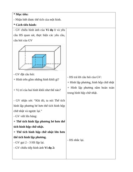 - Nhận biết được thể tích của một hình. * Cách tiến hành: