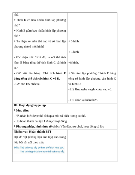 - GV nhận xét: “Khi đó ta nói thể tích + 5 hình lập phương nhỏ.
