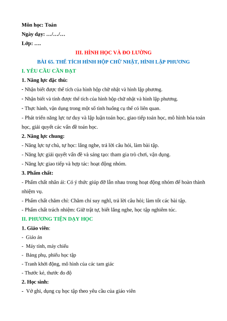 Giáo án Thể tích hình hộp chữ nhật, hình lập phương Toán lớp 5 Cánh diều