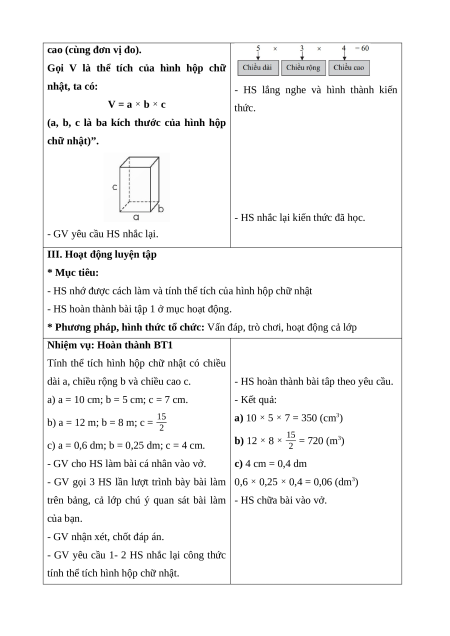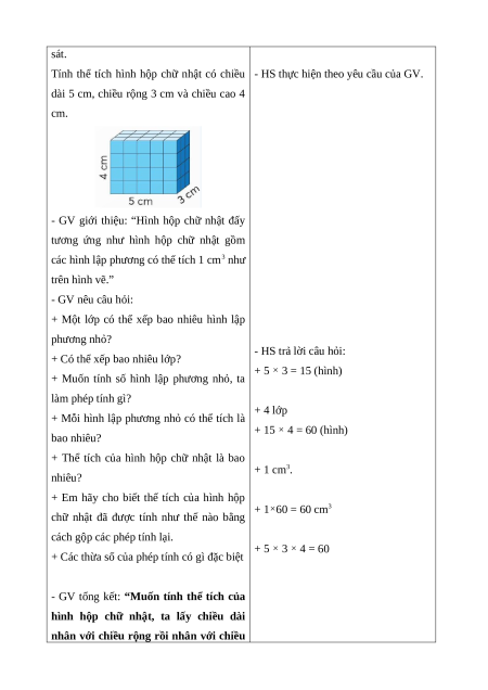 Giáo án Thể tích hình hộp chữ nhật Toán lớp 5 Chân trời sáng tạo