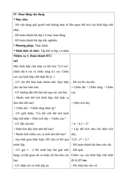 Nhớ được cách tính thể tích của hình hộp chữ nhật. * Cách tiến hành: