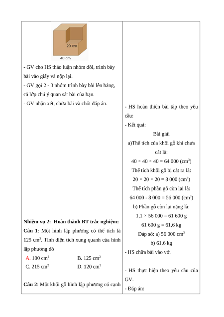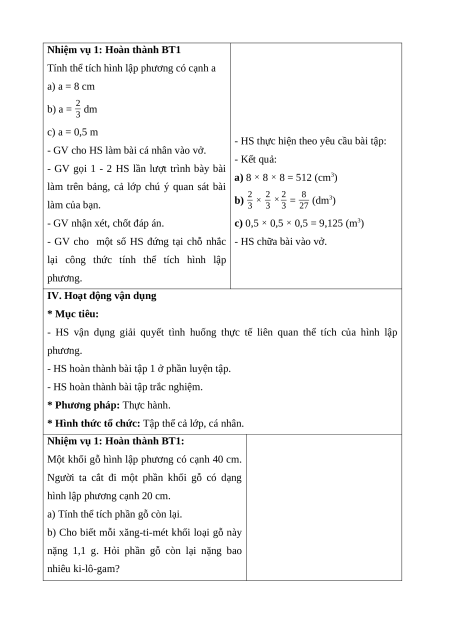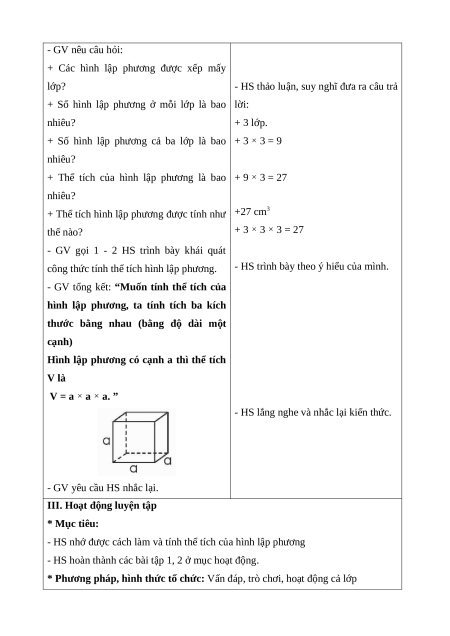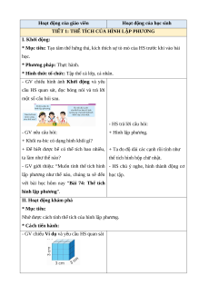 Nhớ được cách tính thể tích của hình lập phương. * Cách tiến hành: