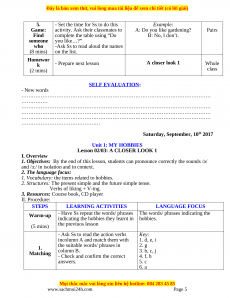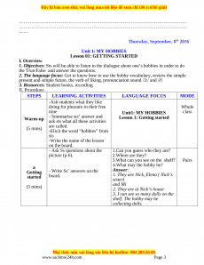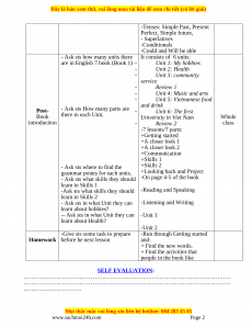 are in English 7 book (Book 1) - Unit 1: My hobbies - Unit 2: Health - Unit 3: community service - Review 1 - Unit 4: Music and arts - Unit 5: Vietnamese food and drink Post- - Ask sts How many parts are - Unit 6: The first Book there in each Unit. University in Viet Nam Whole introduction - Review 2 class -7 lessons/7 parts: +Getting started +A closer look 1 +A closer look 2 +Communication +Skills 1 - Ask sts where to find the +Skills 2 grammar points for each units. +Looking back and Project