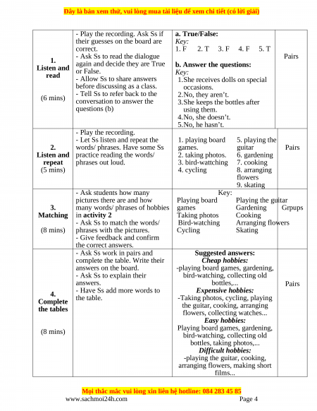-playing board games, gardening, - Ask Ss to explain their bird-watching, collecting old answers. bottles,... Pairs 4. - Have Ss add more words to