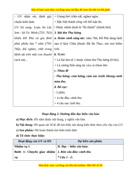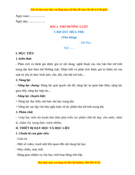 BÀI 2. THƠ ĐƯỜNG LUẬT CẢM XÚC MÙA THU (Thu hứng) - Đỗ Phủ - Tiết:…… I. MỤC TIÊU 1. Kiến thức