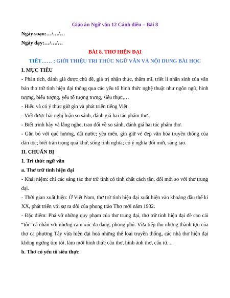 Giáo án Ngữ văn 12 Cánh diều – Bài 8