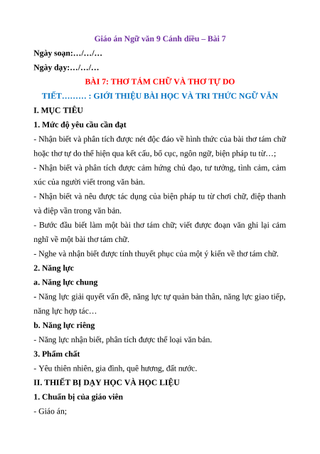 Giáo án Ngữ văn 9 Cánh diều – Bài 7