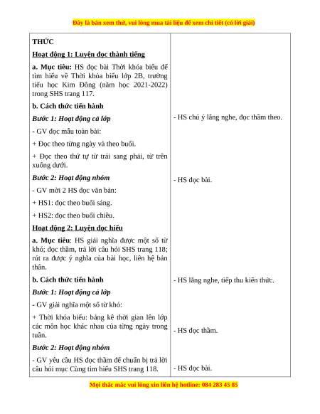 - Đọc được thời khóa biểu theo hai cách, hiểu được nội dung bài đọc: Thời khóa
