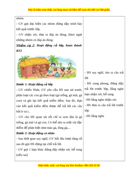 ầ HS uan sát tranh, trả l i ờ trư c ớ l p, ớ l ng ắ nghe phân lo i ạ các con gà theo lo i ạ (gà tr ng, gà m ố ái, gà b n nh ạ n ậ xét, bổ sung. con) và ghi l i ạ k t ế quả ki m ể đ m ế . Sau đó, d a ự - HS l ng ắ nghe nh n xét ậ . vào k t ế quả ki m ế đ m ế đư c ợ để trả l i ờ các câu - HS đ a ư ra câu trả l i ờ trư c ớ h i ỏ b và c. l p ớ - GV cho HS quan sát r i