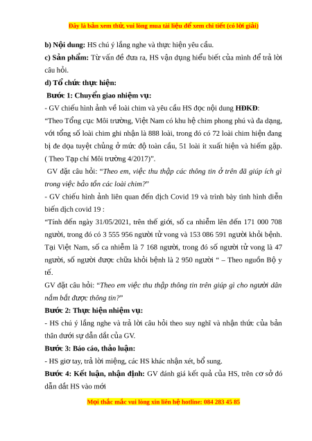 ậ là 888 loài, trong đó có 72 loài chim hi n ệ đang bị đe d a ọ tuy t ệ ch ng ủ ở m c ứ độ toàn c u, ầ 51 loài ít xu t ấ hi n ệ và hi m ế g p. ặ ( Theo T p chí ạ Môi trư ng 4/ ờ 2017)”. GV đ t ặ câu h i ỏ : “Theo em, vi c ệ thu th p