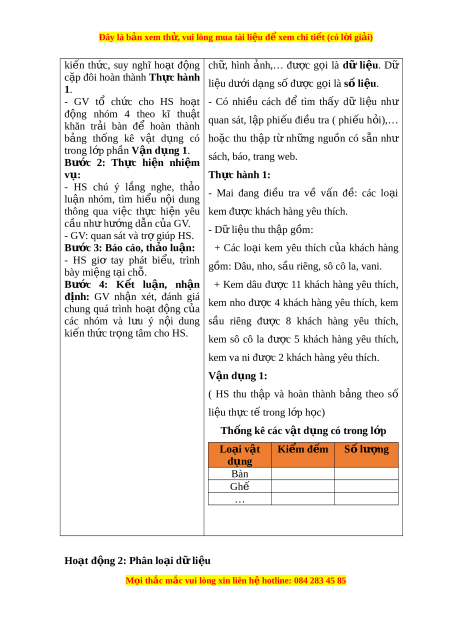 hoàn thành Thực hành li u d ệ ư i ớ d ng ạ s đ ố ư c ợ g i ọ là số li u ệ . 1. - GV tổ ch c ứ cho HS ho t ạ - Có nhi u ề cách để tìm th y ấ dữ li u ệ như đ ng ộ nhóm 4 theo kĩ thu t ậ quan sát, l p ậ phi u ế đi u ề tra ( phi u ế h i ỏ ),… khăn tr i ả bàn để hoàn thành b ng ả th ng ố kê v t ậ d ng ụ có ho c ặ thu th p ậ từ nh ng ữ ngu n ồ có s n ẵ như trong l p ph ớ ần Vận d ng 1 ụ . sách, báo, trang web. Bư c ớ 2: Th c ự hi n ệ nhi m ệ v : ụ Thực hành 1: - HS chú ý l ng ắ nghe, th o ả - Mai đang đi u ề tra về v n ấ đ : ề các lo i ạ lu n ậ nhóm, tìm hi u ể n i ộ dung thông qua vi c ệ th c ự hi n ệ yêu kem đư c ợ khách hàng yêu thích. cầu nh h ư ư ng d ớ ẫn c a ủ GV. - D l ữ i u t ệ hu th p g ậ m ồ : - GV: quan sát và tr gi ợ úp HS. Bư c
