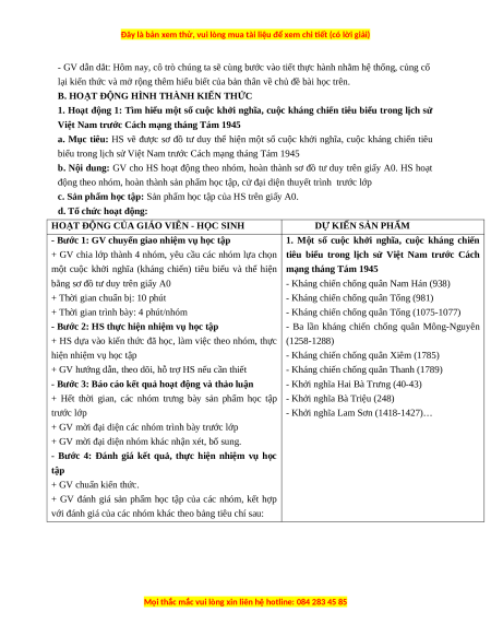 1. Hoạt động 1: Tìm hiểu một số cuộc khởi nghĩa, cuộc kháng chiến tiêu biểu trong lịch sử