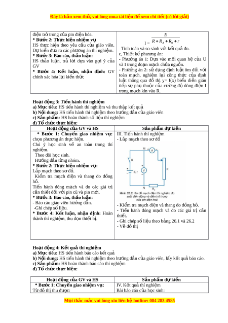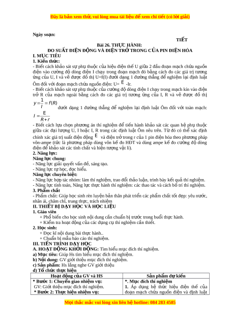 Đây là bản xem th , vu ử i lòng mua tài li u ệ đ xe ể m chi ti t ế (có l i ờ gi i ả ) Ngày soạn: TI T Ế Bài 26. THỰC HÀNH: ĐO SU T Ấ ĐI N Ệ Đ N Ộ G VÀ ĐI N Ệ TR Ở TRONG C A Ủ PIN ĐI N Ệ HÓA I. MỤC TIÊU 1. Ki n ế th c ứ : - Bi t ế cách kh o ả sát s ự ph ụ thu c ộ c a ủ hi u ệ đi n ệ th ế U gi a ữ 2 đ u ầ đo n ạ m c ạ h ch a ứ ngu n ồ đi n ệ vào cư ng ờ độ dòng đi n ệ I ch y ạ trong đo n ạ m c ạ h đó b ng