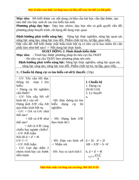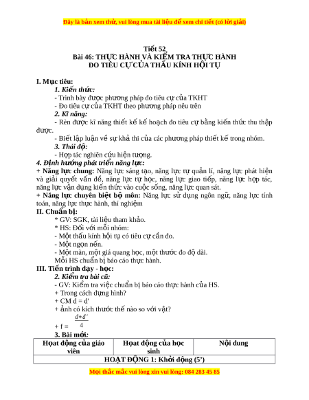 Đây là bản xem th , vu ử i lòng mua tài li u ệ đ xe ể m chi ti t (c ế ó l i ờ gi i ả ) Ti t ế 52 Bài 46: TH C Ự HÀNH VÀ KI M Ể TRA TH C Ự HÀNH ĐO TIÊU C C Ự A Ủ THẤU KÍNH H I Ộ TỤ I. M c t ụ iêu: 1. Ki n ế th c: ứ - Trình bày đư c ph ợ ư ng ơ pháp đo tiêu c c ự a ủ TKHT - Đo tiêu c c ự a ủ TKHT theo phư ng pháp ơ nêu trên 2. Kĩ năng: - Rèn đư c ợ kĩ năng thi t ế kế kế ho ch ạ đo tiêu c ự b ng ằ ki n ế th c ứ thu th p ậ đư c. ợ - Bi t ế l p ậ lu n v ậ s ề ự kh t ả hi c a ủ các phư ng ơ pháp thi t ế k t ế rong nhóm. 3. Thái đ : ộ - H p t ợ ác nghiên c u hi ứ n t ệ ư ng. ợ 4. Đ nh h ị ư ng phát ớ tri n năng l ể c: ự + Năng l c ự chung: Năng l c ự sáng t o, ạ năng l c ự tự qu n ả lí, năng l c ự phát hi n ệ và gi i ả quy t ế v n ấ đ , ề năng l c ự tự h c, ọ năng l c ự giao ti p, ế năng l c ự h p ợ tác, năng l c ự v n d ậ ng ki ụ n t ế h c ứ vào cu c s ộ ng, ố năng l c quan s ự át. + Năng l c ự chuyên bi t