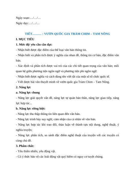 TIẾT……… : VƯỜN QUỐC GIA TRÀM CHIM – TAM NÔNG I. MỤC TIÊU
