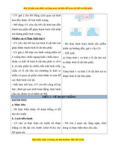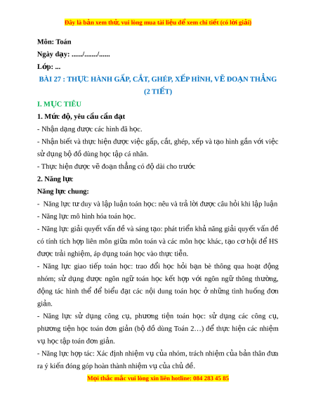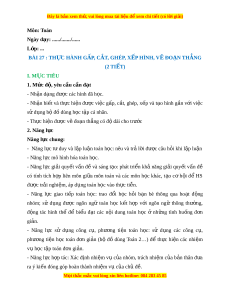 Ngày dạy: ....../......./...... L p: ớ ... BÀI 27 : TH C Ự HÀNH G P Ấ , C T Ắ , GHÉP, X P Ế HÌNH, V Đ Ẽ O N Ạ TH N Ẳ G (2 TI T Ế ) I. M C Ụ TIÊU 1. Mức đ , ộ yêu c u c ầ n đ ầ t ạ - Nh n d ậ ng ạ đư c ợ các hình đã h c. ọ - Nh n bi ậ t ế và th c hi ự n đ ệ ư c vi ợ c g ệ p, c ấ t ắ , ghép, x p và t ế o hì ạ nh g n ắ v i ớ vi c ệ sử d ng b ụ đ ộ ồ dùng h c t ọ p ậ cá nhân. - Th c hi ự n đ ệ ư c ợ v đo ẽ n ạ th ng có đ ẳ dài ộ cho trư c ớ 2. Năng l c ự Năng l c chung ự : - Năng l c t ự duy và ư l p l ậ u n t ậ oán h c: ọ nêu và tr l ả i ờ đư c ợ câu h i ỏ khi l p ậ lu n ậ - Năng l c m ự ô hình hóa toán h c. ọ - Năng l c ự gi i ả quy t ế v n ấ đ và ề sáng t o: ạ phát tri n ể kh ả năng gi i ả quy t ế v n ấ đề có tính tích h p ợ liên môn gi a