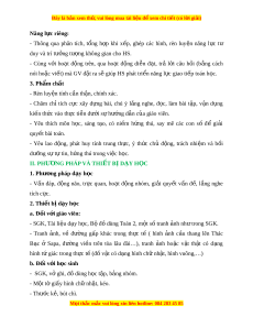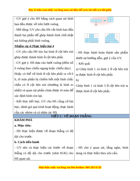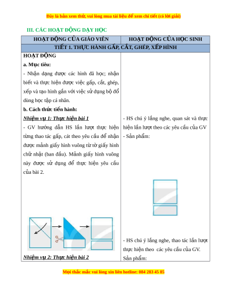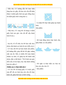 Đây là bản xem th , vu ử i lòng mua tài li u ệ đ xe ể m chi ti t (c ế ó l i ờ gi i ả ) III. CÁC HO T Ạ Đ N Ộ G D Y Ạ H C Ọ HOẠT Đ N Ộ G C A Ủ GIÁO VIÊN HOẠT Đ N Ộ G C A Ủ H C Ọ SINH TIẾT 1. TH C Ự HÀNH G P Ấ , C T Ắ , GHÉP, X P Ế HÌNH HOẠT Đ N Ộ G a. Mục tiêu: - Nh n ậ d ng ạ đư c ợ các hình đã h c; ọ nh n ậ bi t ế và th c ự hi n ệ đư c ợ vi c ệ g p, ấ c t ắ , ghép, x p và ế t o ạ hình g n ắ v i ớ vi c ệ s ử d ng b ụ đ ộ ổ dùng h c t ọ p ậ cá nhân. b. Cách th c t ứ i n hành: ế Nhi m ệ v 1 ụ : Th c hi ự n bài ệ 1 - HS chú ý l ng ắ nghe, quan sát và th c ự - GV hư ng ớ d n ẫ HS l n ầ lư t ợ th c ự hi n ệ hiện lần lư t ợ theo các yêu c u c ầ a ủ GV t ng ừ thao tác g p, ấ cát theo yêu c u ầ để nh n ậ - S n ả phẩm: đư c ợ m nh ả gi y ấ hình vuông t ừ t ờ gi y ấ hình chữ nh t ậ (ban đ u ầ ). M nh ả gi y ấ hình vuông này được sử d ng ụ để th c ự hi n ệ yêu c u ầ c a bài ủ 2. - HS chú ý l ng ắ nghe, thao tác l n ầ lư t ợ th c hi ự ện theo các yêu c u c ầ a ủ GV. Nhi m ệ v 2 ụ : Th c hi ự n bài ệ 2 S n ph ả ẩm: M i