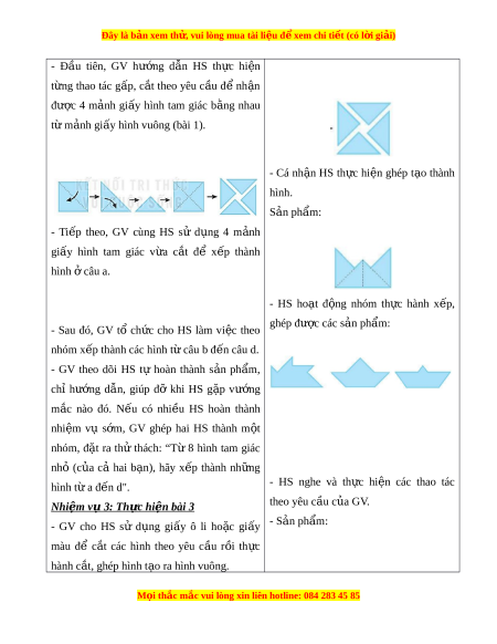 Đây là bản xem th , vu ử i lòng mua tài li u ệ đ xe ể m chi ti t (c ế ó l i ờ gi i ả ) - Đ u ầ tiên, GV hư ng ớ d n ẫ HS th c ự hi n ệ t ng ừ thao tác g p, ấ c t ắ theo yêu c u ầ đ ể nh n ậ đư c ợ 4 m nh ả gi y ấ hình tam giác b ng ằ nhau t m ừ nh gi ả ấy hình vuông (bài 1). - Cá nh n ậ HS th c ự hi n ệ ghép t o ạ thành hình. S n ph ả ẩm: - Ti p