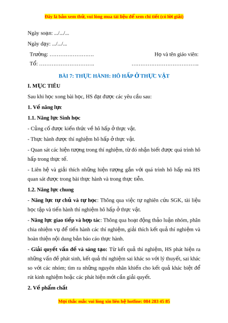 ……………………………….. BÀI 7: TH C Ự HÀNH: HÔ H P Ấ Ở TH C Ự V T Ậ I. M C Ụ TIÊU Sau khi h c ọ xong bài h c, H ọ S đ t ạ được các yêu c u s ầ au: 1. V năng l ề c ự 1.1. Năng l c Si ự nh h c ọ - C ng c ủ ố đư c ợ ki n t ế h c v ứ hô h ề p ấ t ở h c ự v t ậ . - Th c hành đ ự ư c ợ thí nghi m ệ hô h p ấ t ở h c ự v t ậ . - Quan sát các hi n ệ tư ng ợ trong thí nghi m ệ , t đó ừ nh n ậ bi t ế đư c ợ quá trình hô hấp trong th c ự t . ế - Liên hệ và gi i ả thích nh ng ữ hi n ệ tư ng ợ g n ắ v i ớ quá trình hô h p ấ mà HS quan sát đư c ợ trong bài th c hành ự và trong th c ự ti n. ễ 1.2. Năng l c chung ự - Năng l c