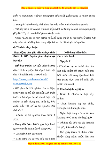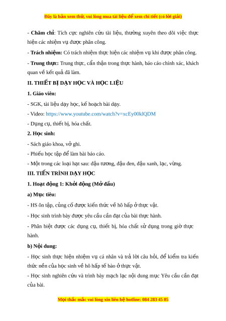 - Video: https://www.youtube.com/watch?v=xcEy00klQDM - D ng c ụ , t ụ hi t ế b , hóa ch ị t ấ . 2. H c ọ sinh: - Sách giáo khoa, vở ghi. - Phi u h ế c t ọ p ậ đ l ể àm bài báo cáo. - M t ộ trong các lo i ạ h t ạ sau: đ u t ậ ư ng, ơ đ u đen, đ ậ u ậ xanh, l c, ạ v ng. ừ III. TI N Ế TRÌNH D Y Ạ H C Ọ 1. Hoạt đ ng 1 ộ : Kh i ơ đ ng ( ộ M đ ơ u) ầ a) M c t ụ iêu: - HS ôn t p, c ậ ng ủ c đ ố ư c ợ ki n t ế h c v ứ hô h ề p ấ t ở h c ự v t ậ . - H c s ọ inh trình bày đư c ợ yêu c u c ầ n đ ầ t ạ c a ủ bài th c hành. ự - Phân bi t ệ đư c ợ các d ng ụ c , ụ thi t ế b ,ị hóa ch t ấ sử d ng ụ trong giờ th c ự hành. b) N i ộ dung: - H c ọ sinh th c ự hi n ệ nhi m