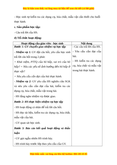 Đây là bản xem th , vu ử i lòng mua tài li u ệ đ xe ể m chi ti t ế (có l i ờ gi i ả ) - H c ọ sinh tự ki m ể tra các d ng ụ c , ụ hóa ch t ấ , m u ẫ v t ậ c n ầ thi t ế cho bu i ổ th c ự hành. c. Sản phẩm h c t ọ p: ậ - Câu tr l ả i ờ c a ủ HS. d) T ch ổ ức ho t ạ đ ng: ộ Hoạt đ ng c ộ a g ủ iáo viên - h c s ọ inh N i ộ dung Bư c