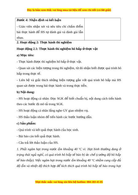ự hành để HS tự đánh giá và đánh giá l n ẫ nhau. 2. Hoạt đ ng 2 ộ : Th c hàn ự h thí nghi m ệ Hoạt đ ng 2.1 ộ : Th c hàn ự h thí nghi m ệ hô h p ấ t ơ h c v ự t ậ a) M c t ụ iêu: - Th c hành đ ự ư c ợ thí nghi m ệ hô h p ấ t ở h c ự v t ậ . - Quan sát các hi n ệ tư ng ợ trong thí nghi m ệ , t đó ừ nh n ậ bi t ế đư c ợ quá trình hô hấp trong th c ự t . ế - Liên hệ và gi i ả thích nh ng ữ hi n ệ tư ng ợ g n ắ v i ớ quá trình hô h p ấ mà HS quan sát đư c ợ trong bài th c hành ự và trong th c ự ti n. ễ b) N i ộ dung: - HS ho t ạ đ ng ộ cá nhân: Đ c ọ SGK đ ể bi t ế chu n ẩ b ,ị n i ộ dung cách ti n ế hành theo các bư c đã ớ mô t t ả rong SGK. - HS ho t ạ đ ng cá ộ nhân l ng nghe ắ GV giao nhi m ệ v . ụ - HS th o l ả u n ậ nhóm đ t ể i n hành các b ế ư c ớ hư ng d ớ n. ẫ c) S n ph ả m ẩ : - Quá trình và k t ế qu t ả h c ự hành c a h ủ c ọ sinh. - Bài báo cáo k t ế qu t ả h c ự hành. - Câu tr l ả i ờ th o ả lu n c ậ a ủ HS. 1. Ph i ả ngâm h t ạ trong nư c ơ m ấ kho ng ả 40 oC vi: H t ạ binh thư ng ơ đang ở tr ng ạ thái ng