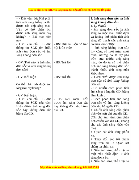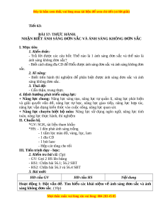 ỏ : Thế nào là 1 ánh sáng đ n ơ s c ắ và thế nào là ánh sáng không đ n s ơ c? ắ - Bi t ế cách dùng đĩa CD đ ể Hi u ể đư c ợ ánh sáng đ n ơ s c ắ và ánh sáng không đ n ơ s c ắ . 2. Kĩ năng: - Bi t ế ti n ế hành thí nghi m ệ để phân bi t ệ đư c ợ ánh sáng đ n ơ s c ắ và ánh sáng không đ n s ơ c. ắ 3. Thái đ : ộ - Cẩn th n, t ậ rung th c. ự 4. Đ nh h ị ư ng phát ớ tri n năng l ể c: ự + Năng l c ự chung: Năng l c ự sáng t o, ạ năng l c ự tự qu n ả lí, năng l c ự phát hi n ệ và gi i ả quy t ế v n ấ đ , ề năng l c ự tự h c, ọ năng l c ự giao ti p, ế năng l c ự h p ợ tác, năng l c ự v n d ậ ng ki ụ n t ế h c ứ vào cu c s ộ ng, ố năng l c quan s ự át. + Năng l c ự chuyên bi t
