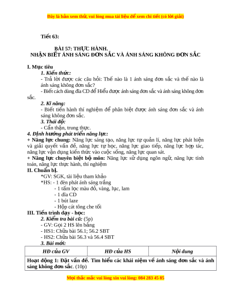 Đây là bản xem th , vu ử i lòng mua tài li u ệ đ xe ể m chi ti t (c ế ó l i ờ gi i ả ) Ti t ế 63: BÀI 57: TH C Ự HÀNH. NHẬN BI T Ế ÁNH SÁNG Đ N Ơ S C