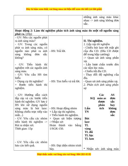 ắ và ánh sáng không Có thể phân tích đư c ợ ánh đ n ơ s c ắ sáng màu hay không? - Có nhi u ề cách phân tích ánh sáng: b ng ằ đĩa CD, b ng ằ - GV: K t ế lu n. ậ lăng kính... - GV: Yêu c u ầ HS đ c ọ - HS: Nêu cách Hi u ể - Cách phân tích ánh sáng