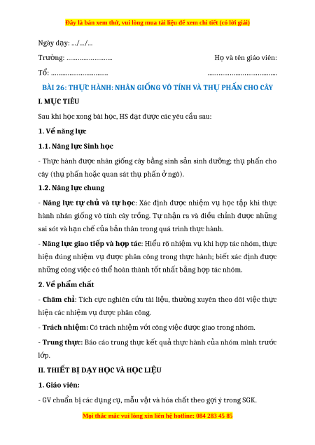 BÀI 26: TH C HÀNH: NHÂN GI Ự NG V Ố Ô TÍNH VÀ TH PH Ụ N CHO CÂ Ấ Y I. M C TIÊU Ụ Sau khi h c x ọ ong bài h c, HS đ ọ t đ ạ c các y ượ êu c u sau: ầ 1. V năng l ề c ự 1.1. Năng l c Sinh h ự c ọ - Th c ự hành đ c ượ nhân gi ng ố cây b ng ằ sinh s n ả sinh d ng; ưỡ th ụ ph n ấ cho cây (th ph ụ n ho ấ c quan sát th ặ ph ụ n ấ ngô). ở 1.2. Năng l c chung ự - Năng l c