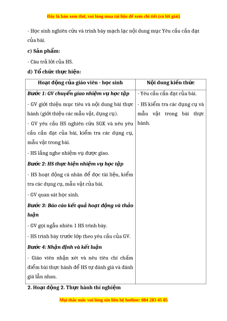 ự Báo cáo trung th c ự k t ế qu ả th c ự hành c a ủ nhóm mình tr c ướ l p. ớ II. THI T B Ế D Ị Y H Ạ C V Ọ À H C LI Ọ U Ệ 1. Giáo viên: - GV chu n b ẩ các d ị ng c ụ , m ụ u v ẫ t v ậ à hóa ch t theo g ấ i ý tr ợ ong SGK.