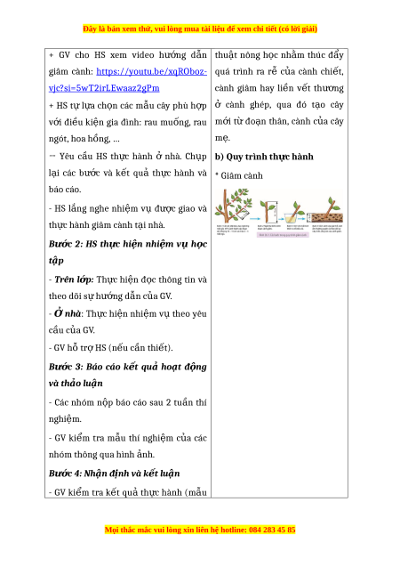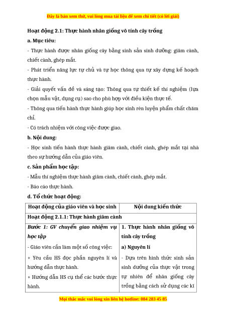 Ho t đ ạ ng 2.1: ộ Th c hành nhân gi ự ng v ố ô tính cây tr ng ồ a. M c tiêu: ụ - Th c ự hành đ c ượ nhân gi ng ố cây b ng ằ sinh s n ả sinh d ng: ưỡ giâm cành, chi t cành, g ế hép m t ắ . - Phát tri n ể năng l c ự tự chủ và tự h c ọ thông qua tự xây d ng ự kế ho ch ạ th c hành. ự - Gi i ả quy t ế v n ấ đề và sáng t o: ạ Thông qua tự thi t ế kế thí nghi m ệ (l a ự ch n m ọ ẫu vật, d ng c ụ ) sao cho phù h ụ p v ợ i đi ớ u ki ề ện th c t ự ế. - Thông qua ti n ế hành th c ự hành giúp h c ọ sinh rèn luy n ệ ph m ẩ ch t ấ chăm ch .ỉ - Có trách nhi m v ệ i công vi ớ c đ ệ c giao. ượ b. N i dung: ộ - Học sinh ti n ế hành th c ự hành giâm cành, chi t ế cành, ghép m t ắ t i ạ nhà theo s h ự ng d ướ n c ẫ a giáo viên. ủ c. S n ph ả m h ẩ c t ọ p: ậ - M u thí ng ẫ hi m th ệ c hành ự giâm cành, chi t cành, g ế hép m t ắ . - Báo cáo th c hành. ự d. T ch ổ c ho ứ t đ ạ ng: ộ Ho t đ ạ ng c ộ a giáo viên v ủ à h c sinh ọ Nội dung ki n th ế c ứ Ho t đ ạ ng 2.1.1: Th ộ c hành giâm cành ự B c
