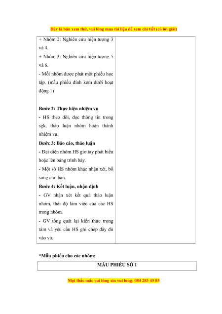 + Nhóm 1: Nghiên cứu hiện tượng 1 đính kèm dưới hoạt động 1. và 2.