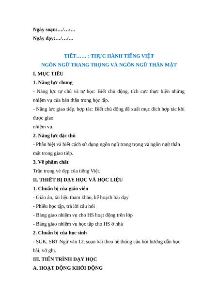 NGÔN NGỮ TRANG TRỌNG VÀ NGÔN NGỮ THÂN MẬT I. MỤC TIÊU 1. Năng lực chung