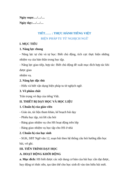 BIỆN PHÁP TU TỪ NGHỊCH NGỮ I. MỤC TIÊU 1. Năng lực chung