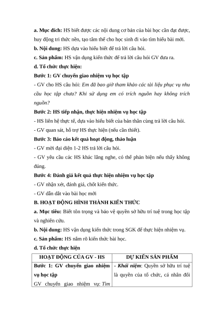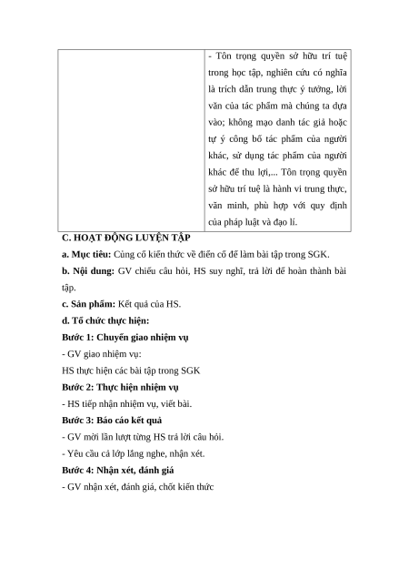 a. Mục tiêu: Biết tôn trọng và bảo vệ quyền sở hữu trí tuệ trong học tập và nghiên cứu.