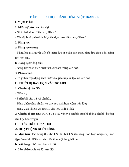 TIẾT……… : THỰC HÀNH TIẾNG VIỆT TRANG 17 I. MỤC TIÊU