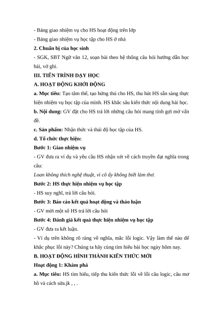 a. Mục tiêu: HS tìm hiểu, tiếp thu kiến thức lỗi về lỗi câu logic, câu mơ hồ và cách sửa.jk , , .
