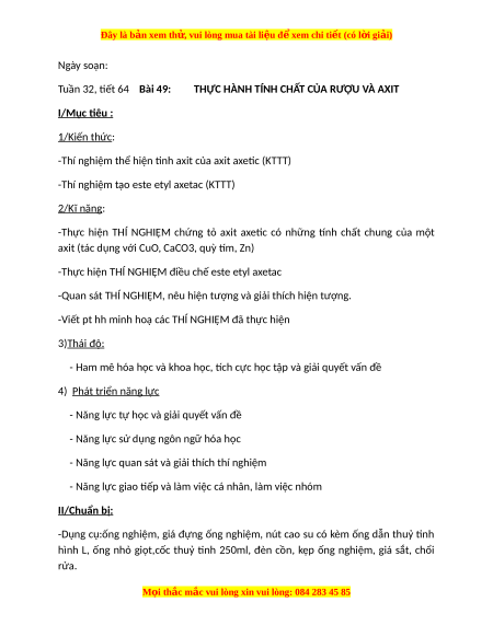 Bài 49:THỰC HÀNH TÍNH CHẤT CỦA RƯỢU VÀ AXIT