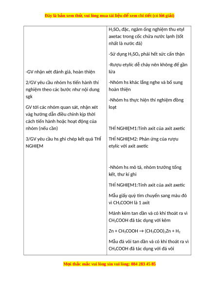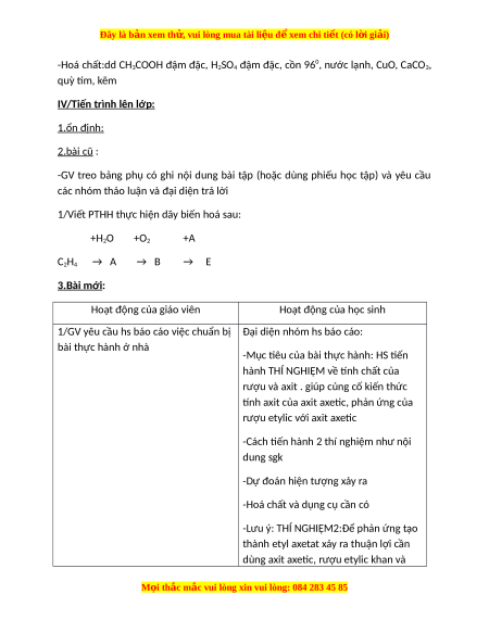 -Hoá chất:dd CH3COOH đậm đặc, H2SO4 đậm đặc, cồn 960, nước lạnh, CuO, CaCO3, quỳ tím, kẽm