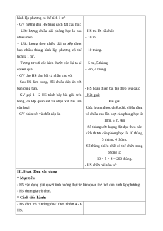 - HS vận dụng giải quyết tình huống thực tế liên quan thể tích của hình lập phương. - HS tham gia trò chơi. * Cách tiến hành:
